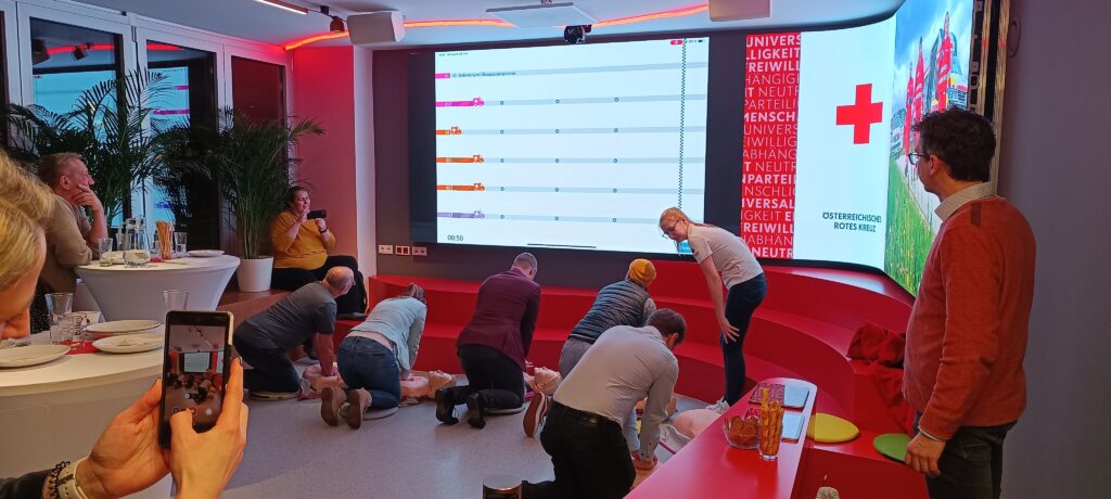Danke an Alex vom Roten Kreuz, dass wir seine neue Lokation im neuen HIL – Humanitarian Innovation Lab auf der Wiedner Hauptstraße besuchen durften. Eine gebogene Videowand, echte Pflanzen überall und ein herrliches Buffett.